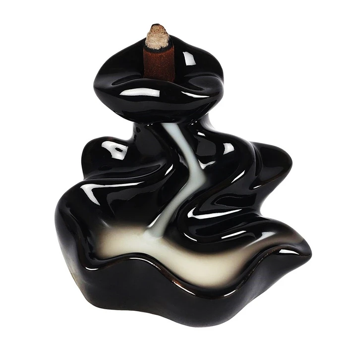 A simple yet beautiful backflow incense burner in a black ceramic flowing river design.