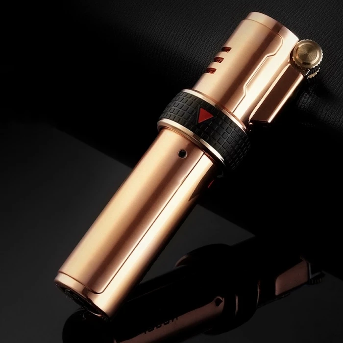 This new Jabon lighter is a sleek and reliable triple-flame jet lighter. Crafted from durable Zinc Alloy, this 88 x 18mm lighter, weighing 78g, boasts a gold hue for added elegance. Using flint for ignition, it features a windproof jet torch and is refillable with butane. It comes in a stylish gift box with two extra flints, enhancing its convenience and functionality.
