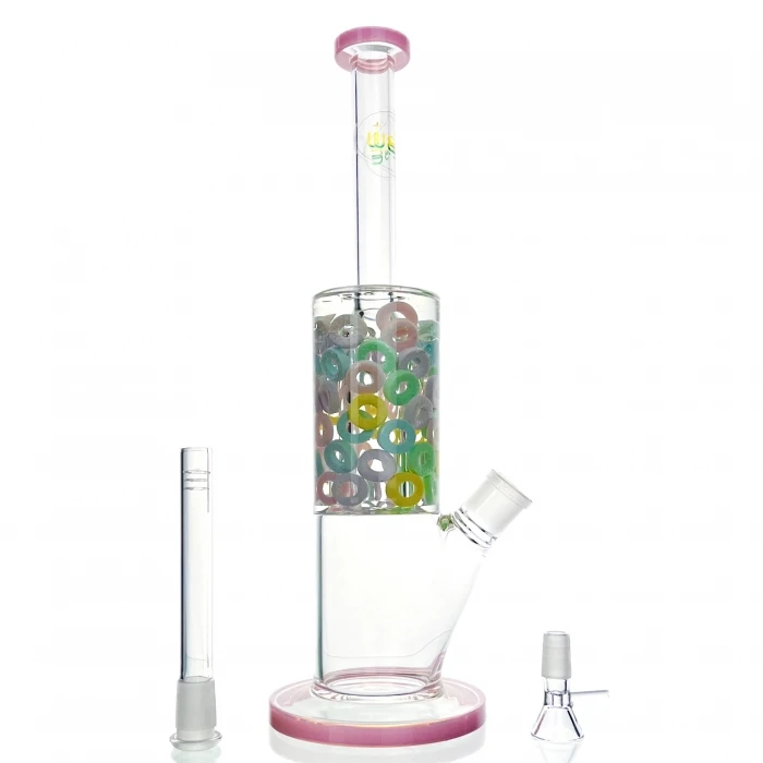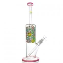 The Candy Ring full glass bong stands tall at 33cm, featuring a sleek pink mouthpiece and bottom rim. It comes with a glass cone and a glass stem for a complete setup. Inside, vibrant coloured candy rings add a playful touch to the smoking experience.