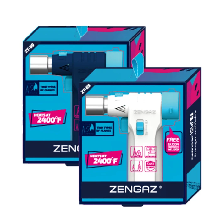 Zengaz ZT69 has a rubberized soft handle. Convenient to use with its mini gun-like shape and ignition button at the front. Two powerful flames (soft and jet), a flame-lock switch, and includes a silicone container at the back.